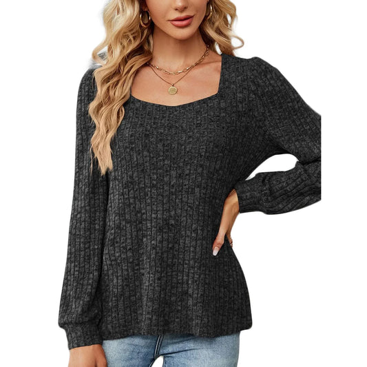 SHIBEVER Womens long sleeve sweater Ribbed slim fit knit Pullover Top Square Neck solid color fall Shirt for women black