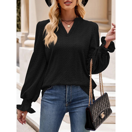 SHIBEVER Womens Tops sweatershirt Long Sleeve V Neck Fall knitwear Eyelet Business Casual 2024 Blouses Smocked Puff clothes BLACK