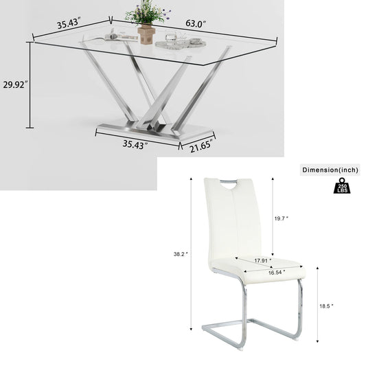 63 rectangele Glass Dining Table Sets for 6,Modern Dining Table with Silver base and 6 Silver Leg PU Chairs Room Set for Kitchen Dining Room,Living room,Glass table and White Chairs