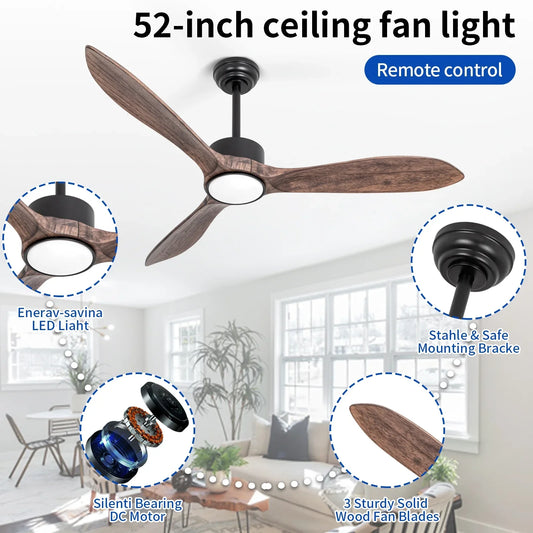 Wozzio 52 inch Ceiling Fan with Light and Remote,DC Motor,3CCT Dimmable LED Light,3 Gray Solid Wood Blades,Indoor & Outdoor