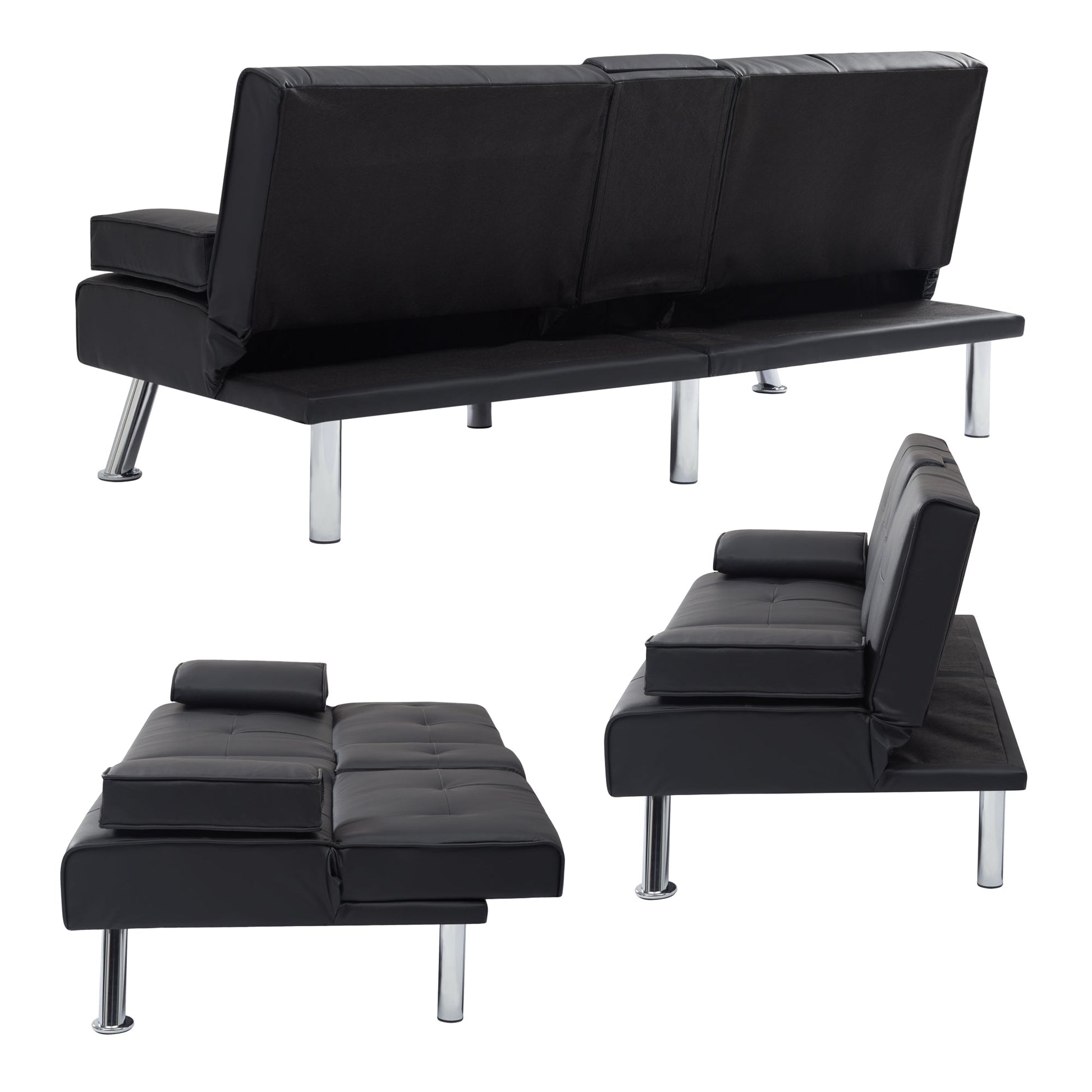 Faux Leather Futon Sofa Bed with Cup Holders and Pillows, Convertible Floding Sofa Couch, Black