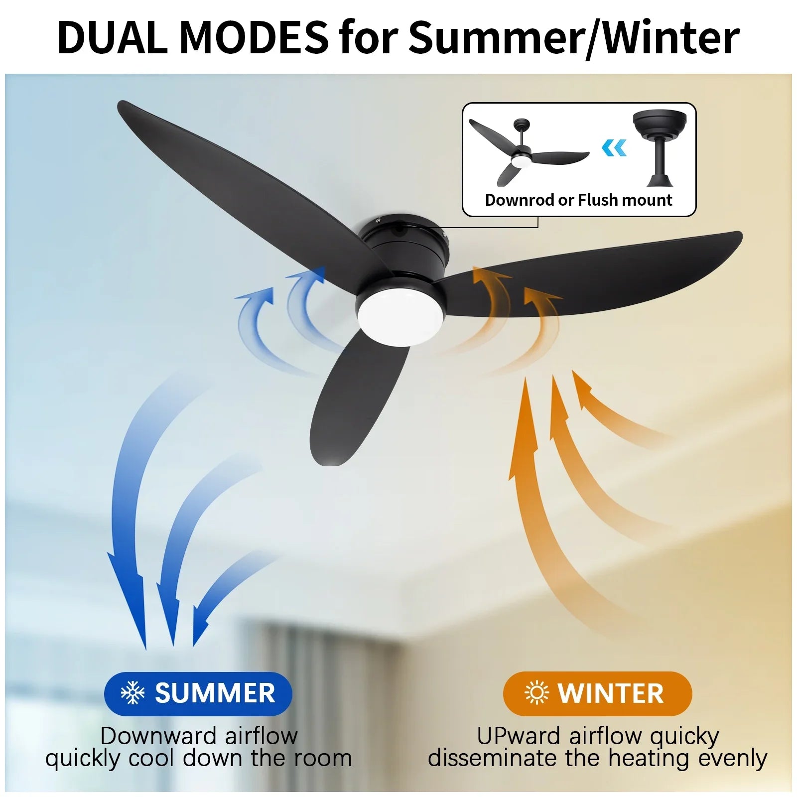 Wozzio 52'' Black Ceiling Fan with Light and Remote Control, 2 Options Installations, 3 ABS Fan Blades, Home